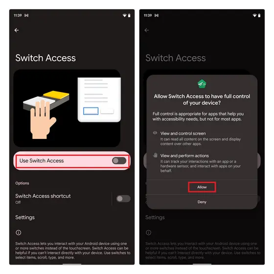 2. Then, enable the ‘Use Switch Access’ toggle to get started. You will now see a pop-up requesting full control of your device to control the screen and perform actions. Tap on ‘Allow’ to confirm and set up the feature.
