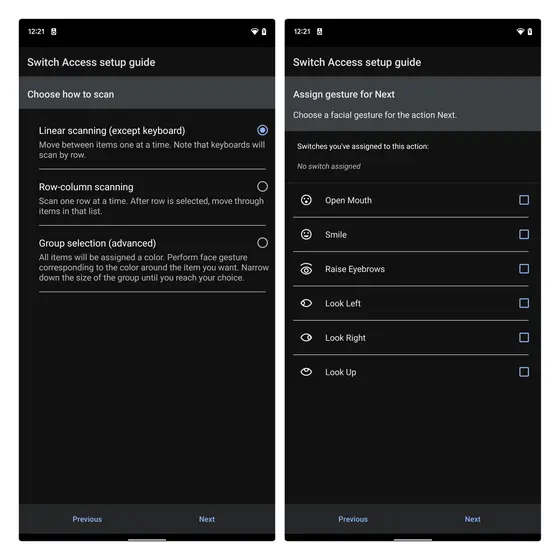 4. You should now pick how Switch Access should scan the contents on your screen. The available options are Linear scanning, Row-column scanning, and Group selection. Pick the method you are comfortable with, and then tap on ‘Next’ in the bottom right corner of the screen. On the next page, pick one of the facial gestures you would like to use.