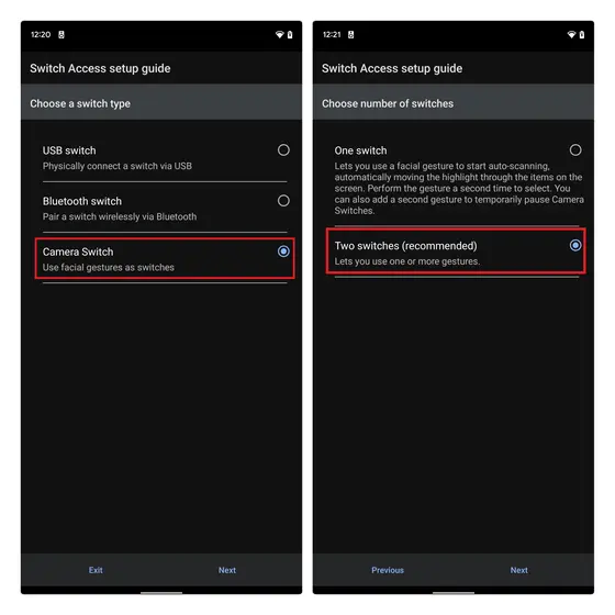 3. Once you have enabled Switch Access, you will see the option to choose a switch type and number of switches. Pick ‘Camera Switch’ as the switch type. You can choose to have one or two switches, but Google recommends using two switches to access more gestures.
